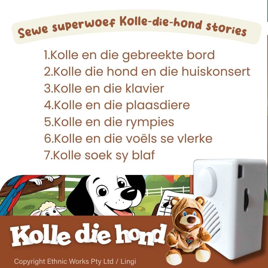 - Lingi kom reeds gelaai met 4000 woorde – liedjies, rympies, dieregeluide, 7 stories en meer – en hy “groei saam met jou kind”. Druk altwee voete en hy word ‘n jaar ouer! GRATIS klank vir Lingi beskikbaar in die Lingi biblioteek: English language bundel, Afrikaanse taalbondel, 7 tradisionele stories, 7 Bybelstories, 7 plaas/trekkerstories, 7 traditional stories (Eng), 7 Bible stories (Eng).